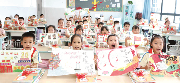 為紀(jì)念中國人民抗日戰(zhàn)爭暨世界反法西斯戰(zhàn)爭勝利80周年,近日,重慶市永川區(qū)上游小學(xué)組織開展了“銘記歷史,弘揚(yáng)偉大抗戰(zhàn)精神”系列思政教育活動。通過主題班會、國旗下講話、書記隊(duì)課及主題繪畫比賽等形式,引導(dǎo)學(xué)生緬懷英雄事跡、珍惜和平生活?;顒佑行Ъぐl(fā)了學(xué)生的愛國熱情,大家紛紛表示要傳承抗戰(zhàn)精神,刻苦學(xué)習(xí)、報(bào)效國家。圖為三年級(6)班學(xué)生展示主題繪畫作品。 陳仕川/攝影報(bào)道